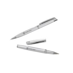 Das Design ist klar, reduziert und zugleich markant: Eine abgeschrägte Kappe beim Rollball sowie ein abgeschrägter Drücker beim Kugelschreiber setzen charakteristische Akzente. Der edle Materialmix aus mattem, verchromtem Edelstahl und glänzendem, verchromtem Messing verleiht beiden Schreibgeräten eine zeitlose Eleganz und sorgt dafür, dass sie in jeder Geschäftssituation einen professionellen Eindruck hinterlassen.