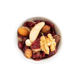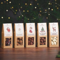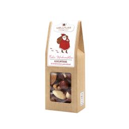 Trüffelmandeln mit Kakao (70 g), Haselnusskerne mit Vollmilchschokolade & Zimt (60 g), Gebrannte Mandeln (60 g), Edelnüsse & Cranberries (60 g) sowie Mandelkerne in weißer Schokolade mit Kokos (60 g).