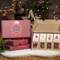 Das Set enthält Trüffelmandeln mit Kakao (70 g), Haselnusskerne mit Vollmilchschokolade und Zimt (60 g), Gebrannte Mandeln (60 g) sowie eine feine Mischung aus Edelnüssen und Cranberries. Alle Sorten werden aus hochwertigen Zutaten gefertigt, sind frei von künstlichen Zusatzstoffen und werden mit Liebe in Deutschland konfektioniert – unter IFS-zertifizierten Produktionsbedingungen.