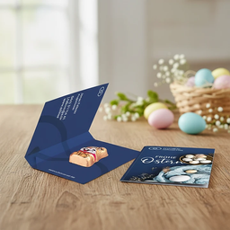 Im Inneren der Karte befindet sich ein Milka Schoko-Osterhase, der deine Werbebotschaft geschmackvoll unterstreicht. Eine kleine, aber wirkungsvolle Aufmerksamkeit, die garantiert positiv in Erinnerung bleibt. Auf Wunsch kann die Karte auch mit einem Klett Schoko-Osterhasen aus bestückt werden. Der Schoko-Osterhase ist mindestens bis zum 30.06.2026 haltbar.