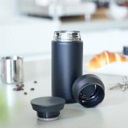 • [Lieferumfang]: Thermosbecher (Material: Edelstahl, doppelwandig, innen elektropoliert, außen pulverbeschichtet, Silikondichtung; Größe: Ø 7 x H 17 cm; Inhalt: 350 ml; Gewicht: 245 Gramm) in einem schwarzen Non-Woven Beutel verpackt.