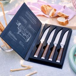 Im Inneren warten vier stilvolle Steakmesser mit einzigartigem Griffdesign in dunkler Holzoptik. Die schwer in der Hand liegenden Messer überzeugen durch durchgeschmiedete Edelstahlklingen, die mühelos und präzise durch jedes Fleisch gleiten. Der ergonomische Griff sorgt für perfekten Halt und angenehmes Schneiden – ob beim Grillabend oder beim festlichen Dinner.